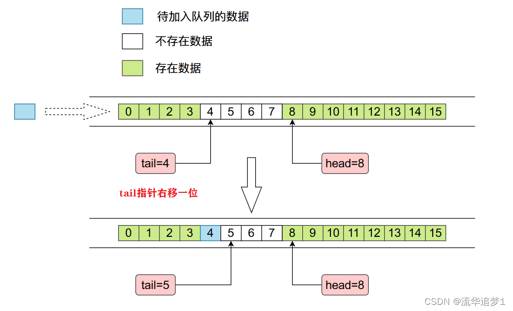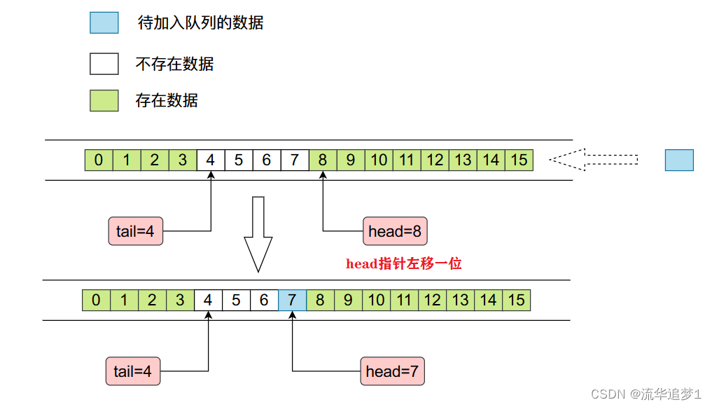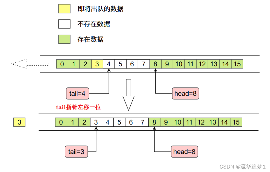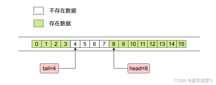 其中 tail 指的位置没有数据,head 指的位置存在数据。