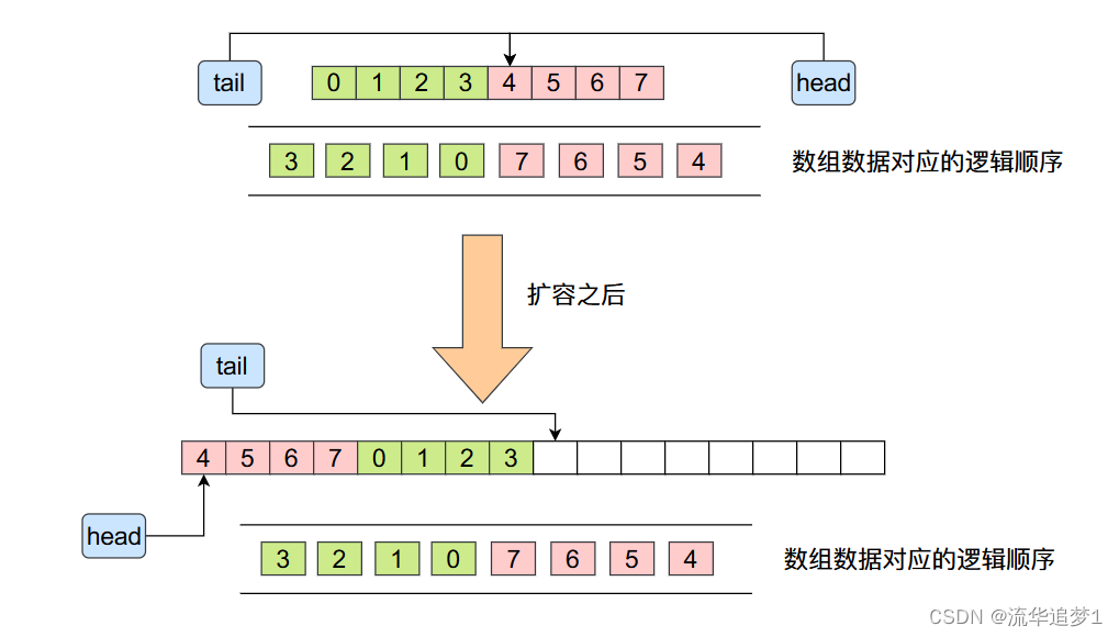 上图中我们看到,head指向首端第一个有效元素,tail指向尾端第一个可以插入元素的空位。因为是循环数组,所以head不一定总等于0,tail也不一定总是比head大。