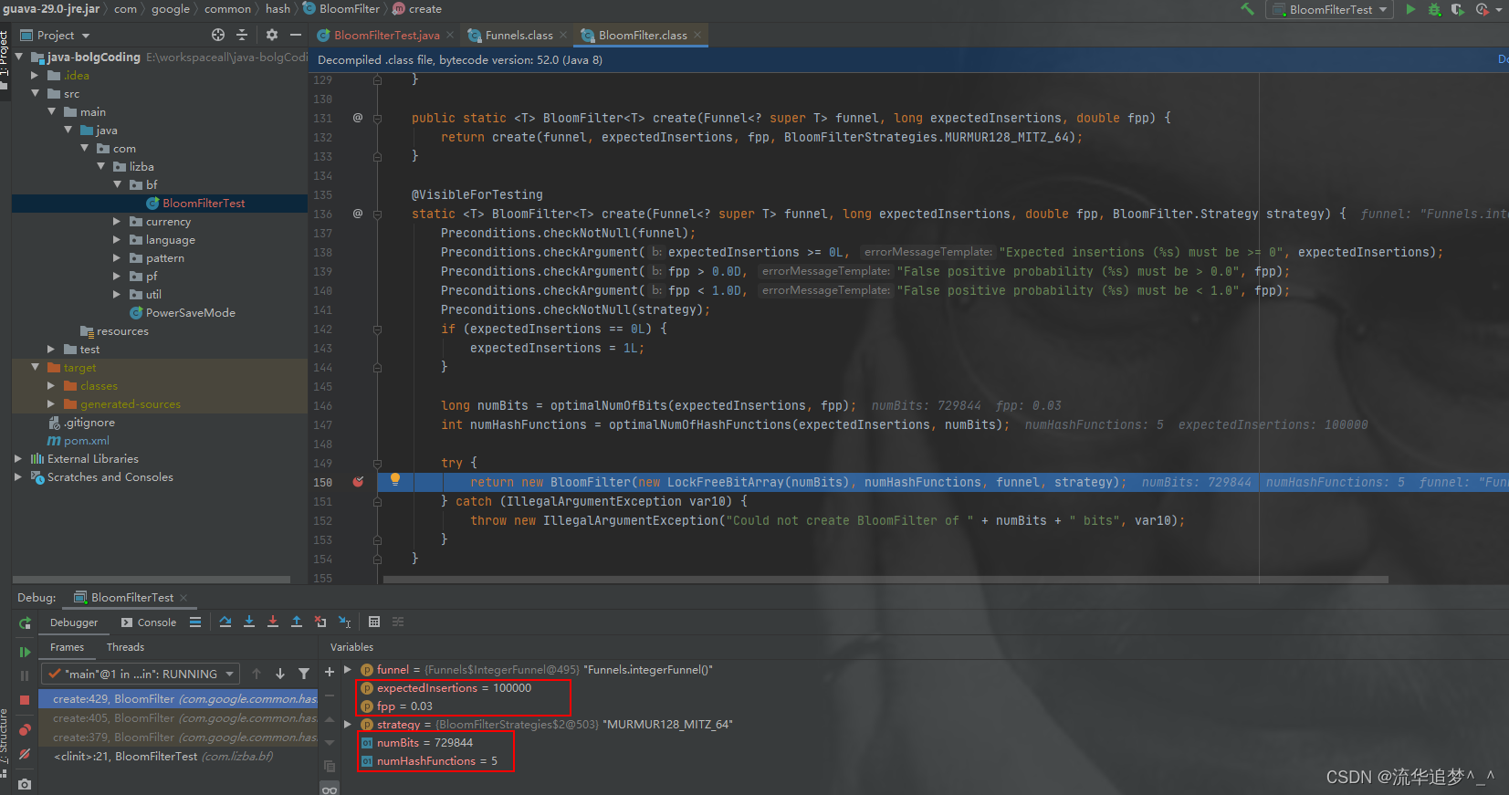 3. 当 expectedInsertions=100000 && fpp=0.03 时,位数组的大小 numBits=729844,hash 函数的个数 numHashFunctions=5。