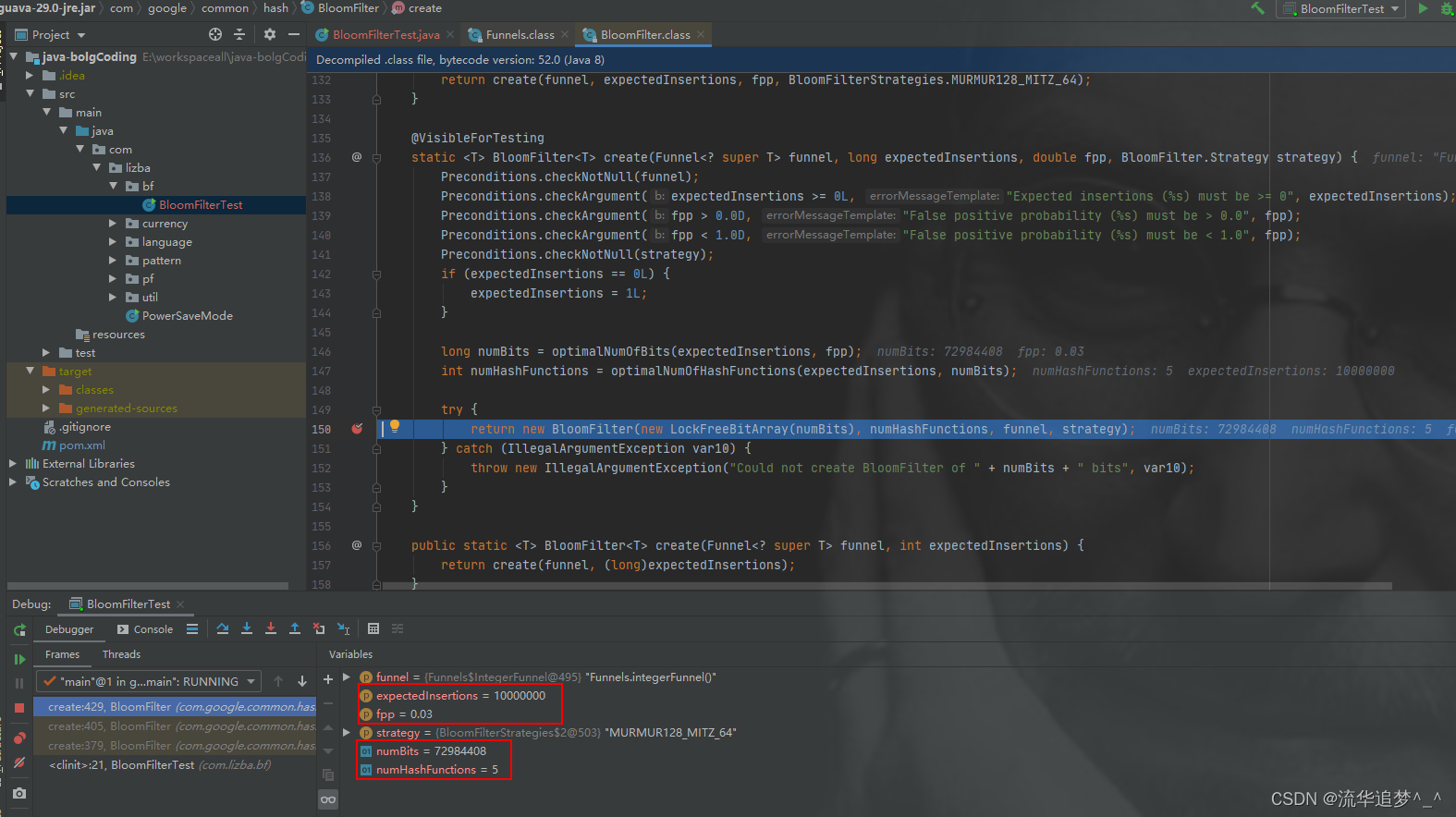 2. 当 expectedInsertions=10000000 && fpp=0.03 时,位数组的大小 numBits=72984408,hash 函数的个数 numHashFunctions=5。