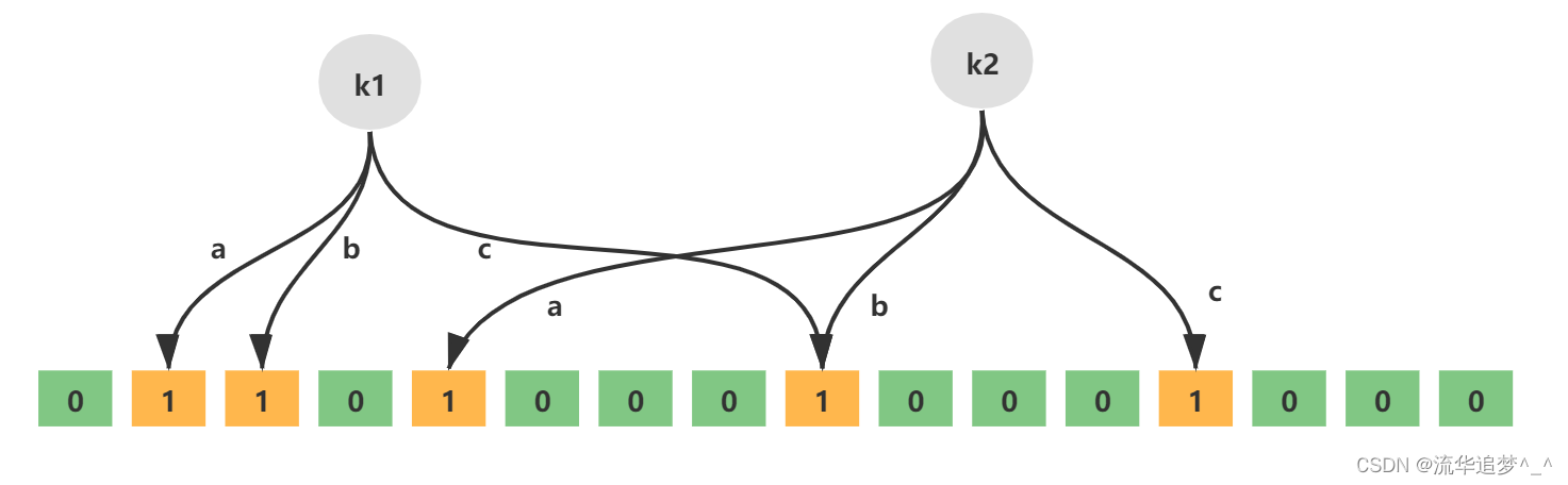 如下就是一个简单的布隆过滤器示意图,其中 k1、k2 代表增加的元素,a、b、c 即为无偏 hash 函数,最下层则为二进制数组。