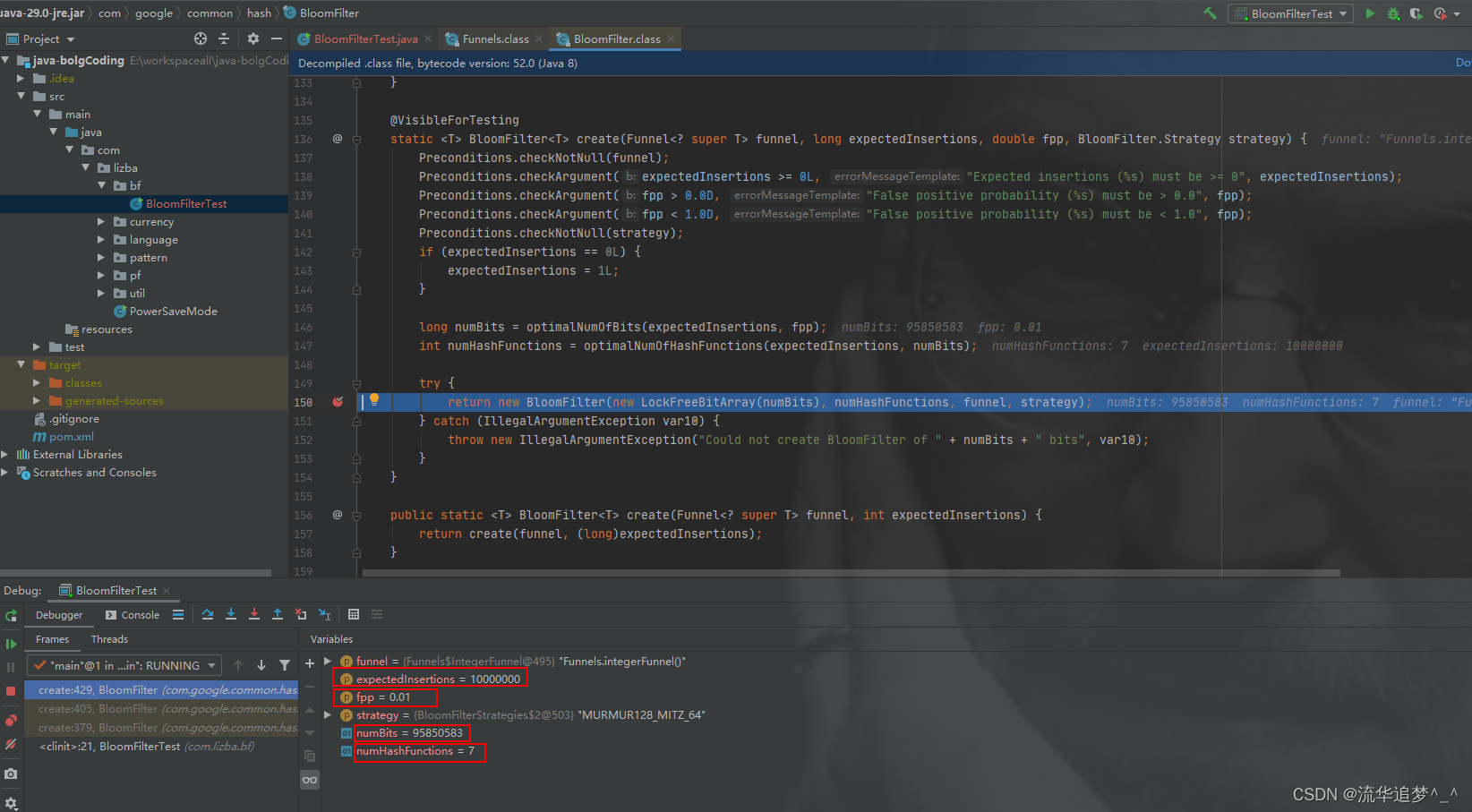 1. 当 expectedInsertions=10000000 && fpp=0.01 时,位数组的大小 numBits=95850583,hash 函数的个数 numHashFunctions=7。