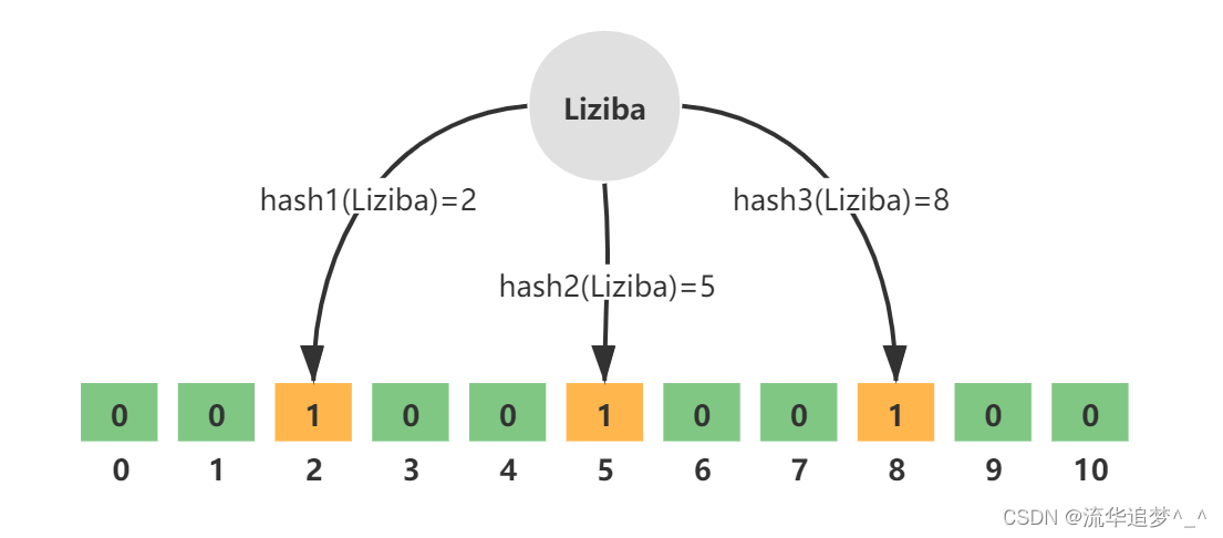 例如,key = Liziba,无偏 hash 函数的个数 k=3,分别为 hash1、hash2、hash3。三个 hash 函数计算后得到三个数组下标值,并将其值修改为 1。如图所示: