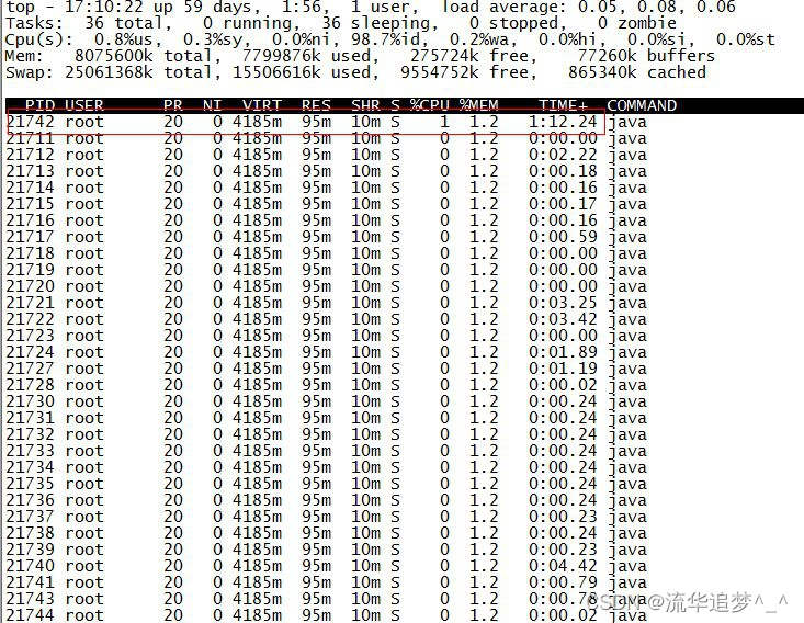 得到进程 ID 为21711,第二步找出该进程内最耗费 CPU 的线程,可以使用 ps -Lfp pid 或者 ps -mp pid -o THREAD, tid, time 或者 top -Hp pid,我这里用第三个,输出如下: