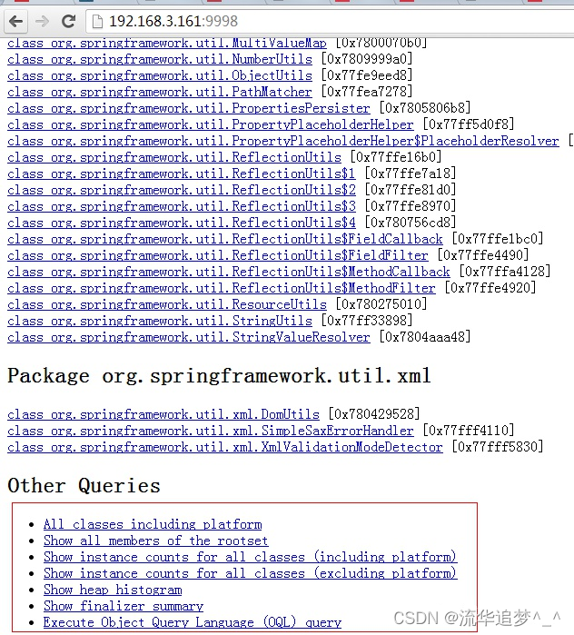 注意如果 Dump 文件太大,可能需要加上 -J-Xmx512m 这种参数指定最大堆内存,即 jhat -J-Xmx512m -port 9998 /tmp/dump.dat。然后就可以在浏览器中输入主机地址 :9998 查看了: