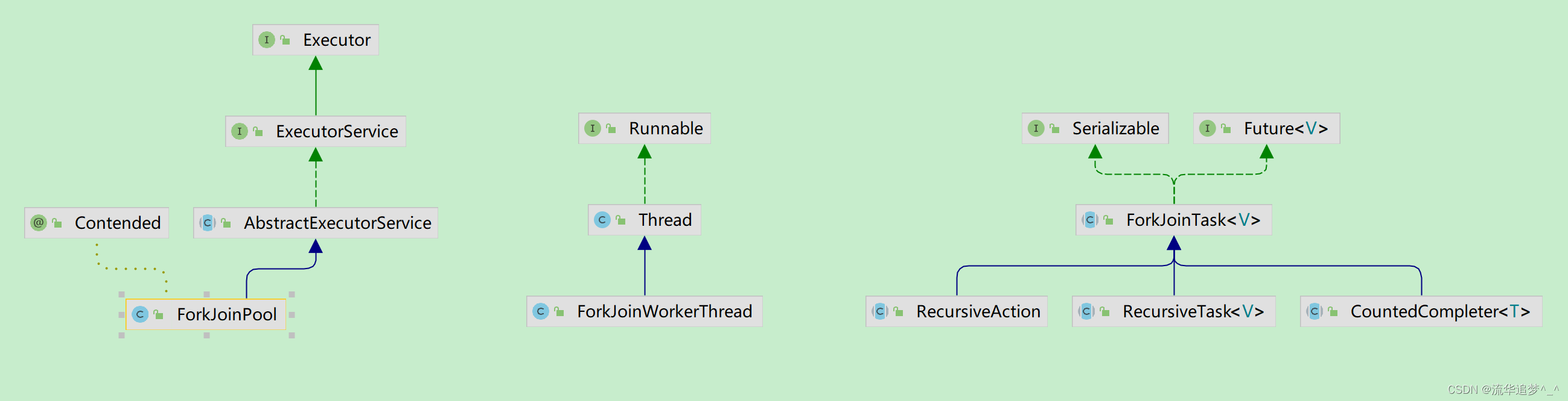 既然任务是被逐渐的细化的,那就需要把这些任务存在一个池子里面,这个池子就是ForkJoinPool,它与其它的 ExecutorService 区别主要在于它使用“工作窃取”。由类图可以看出,ForkJoinPool 类实现了线程池的 Executor接口。我们还可以使用 Executors.newWorkStealPool() 方法来创建 ForkJoinPool。
