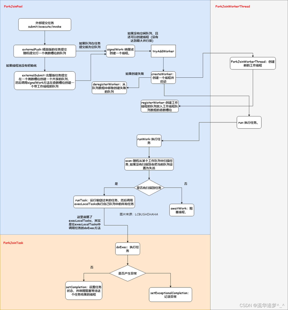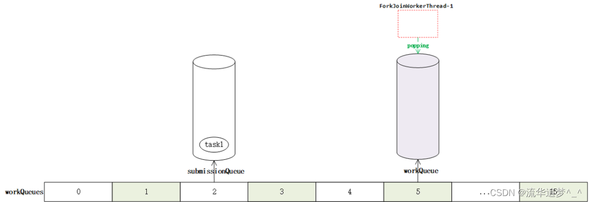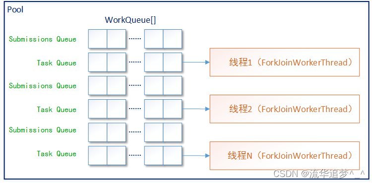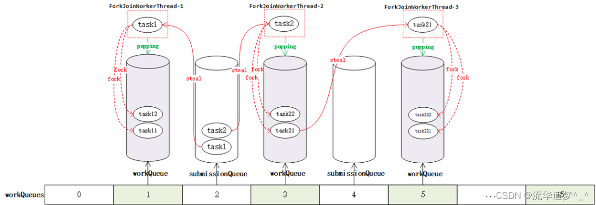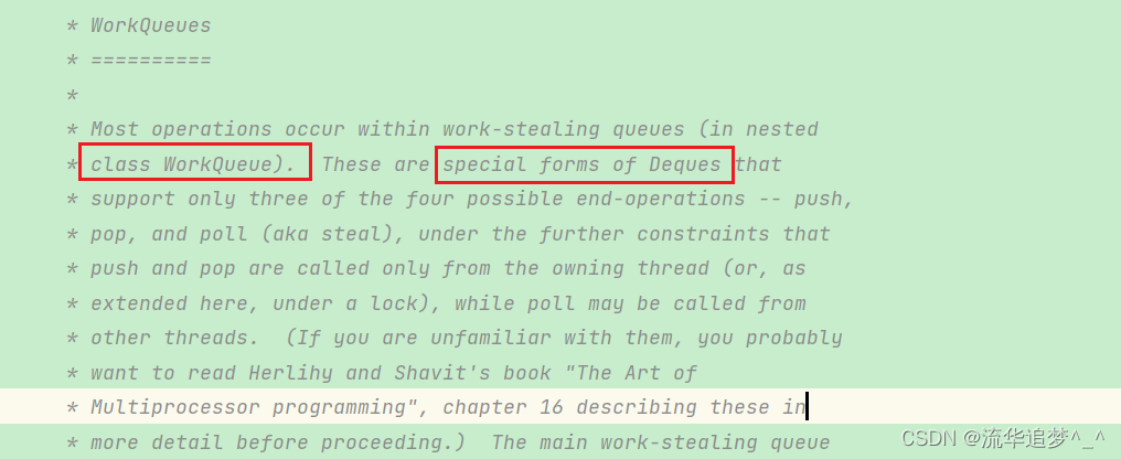 大意是大多数操作都发生在工作窃取队列中(在嵌套类工作队列中)。这些是特殊形式的Deques,主要有 push、pop、poll 操作。