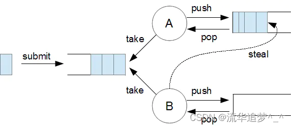 - 当调用 fork 方法时,将任务放进队列头部,线程以 LIFO 顺序,使用 push/pop 方式处理队列中的任务。