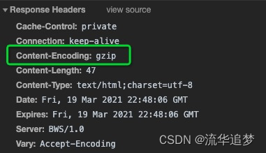 启用 gzip 同时需要客户端和服务端的支持,如果客户端支持 gzip 的解析,那么只要服务端能够返回 gzip 的文件就可以启用 gzip 了,我们可以通过 Nginx 的配置来让服务端支持 gzip 。下面的 Respone 中 Content-Encoding: gzip,指服务端开启了 gzip 的压缩方式。