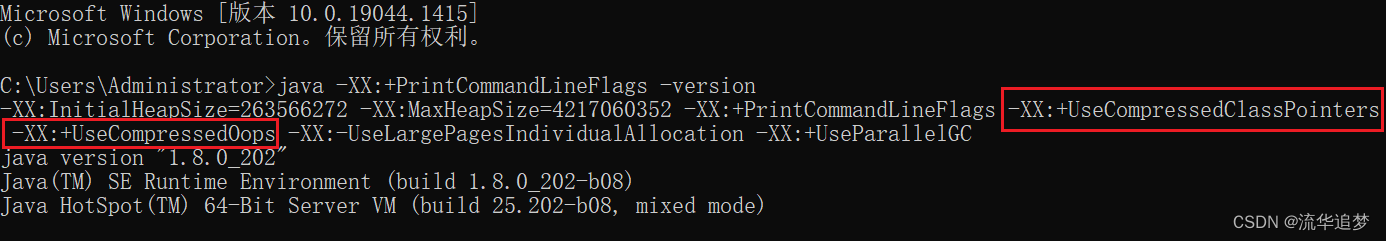 Oops 是 Ordinary object pointers 的缩写,这两个参数默认是开启的,即 -XX:+UseCompressedClassPointers,-XX:+UseCompressedOops,也可手动设置,如下所示: