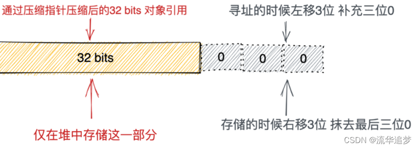 所以在64位系统下,通过压缩指针我们可以继续使用32位来处理(引用指针由8字节可降低到4字节),存储的时候右移3位,寻址的时候左移3位,如下图所示: