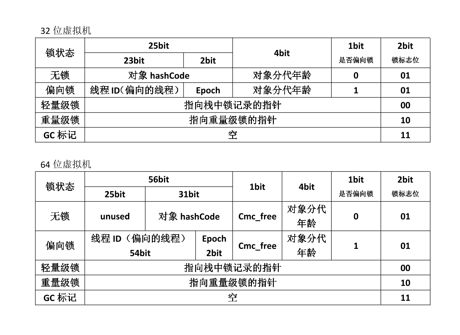 - GC 标记 —— 开辟 62bit 的内存空间却没有占用,2bit 空间存放锁标志位为11。其中无锁和偏向锁的锁标志位都是01,只是在前面的 1bit 区分了这是无锁状态还是偏向锁状态。