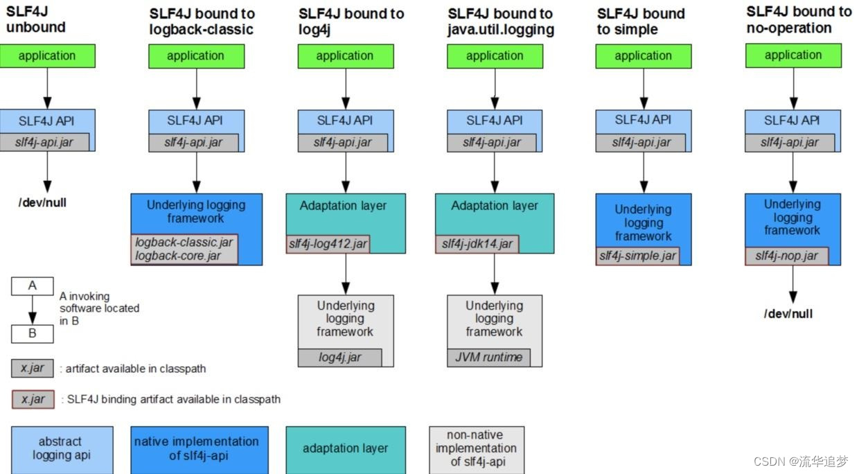 因为当时 Java 的日志组件比较混乱繁杂,Ceki Gülcü 推出 slf4j 后,也相应为行业中各个主流日志组件推出了 slf4j 的适配,图来源于官方文档: