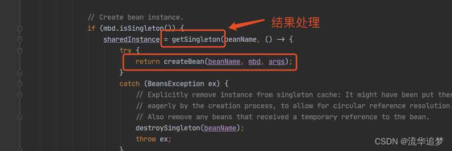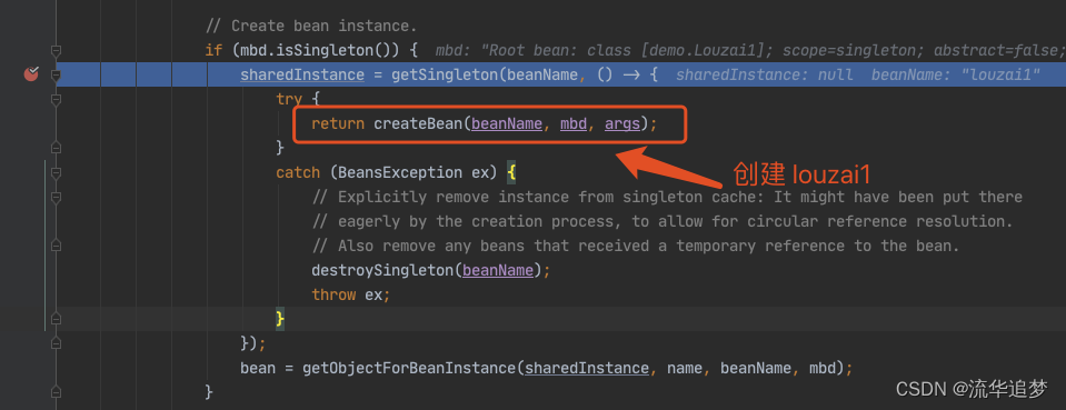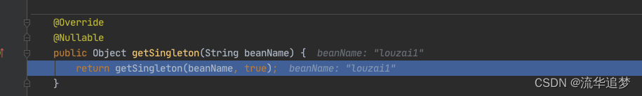 甭着急,看这里,还记得在 doGetBean() 中,我们会通过 createBean() 创建一个 louzai2 的 Bean,当 louzai2 的 Bean 创建成功后,我们会执行 getSingleton(),它会对 louzai2 的结果进行处理。