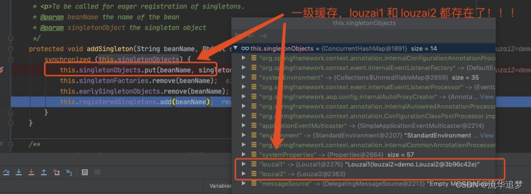 我们先说“一级缓存”的作用,变量命名为 singletonObjects,结构是 Map<String, Object>,它就是一个单例池,将初始化好的对象放到里面,给其它线程使用,如果没有第一级缓存,程序不能保证 Spring 的单例属性。