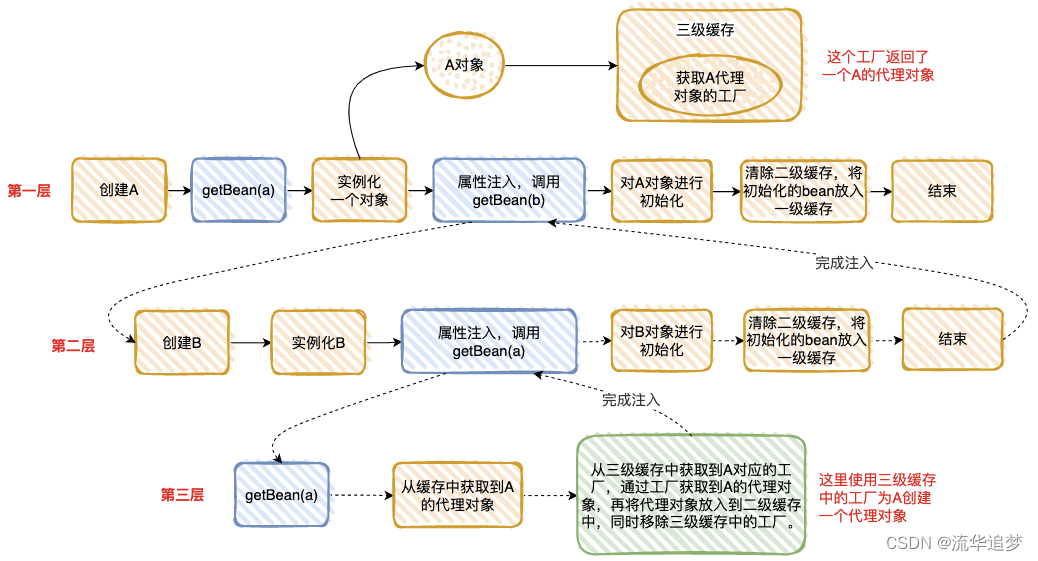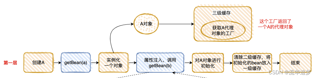 - 在第一层中,先去获取 A 的 Bean,发现没有就准备去创建一个,然后将 A 的代理工厂放入“三级缓存”(这个 A 其实是一个半成品,还没有对里面的属性进行注入),但是 A 依赖 B 的创建,就必须先去创建 B;