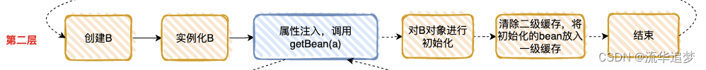 - 回到第一层,现在 B 初始化成功,完成 A 对象的属性注入,然后再填充 A 的其它属性,以及 A 的其它步骤(包括 AOP),完成对 A 完整的初始化功能(这里的 A 才是完整的 Bean)。