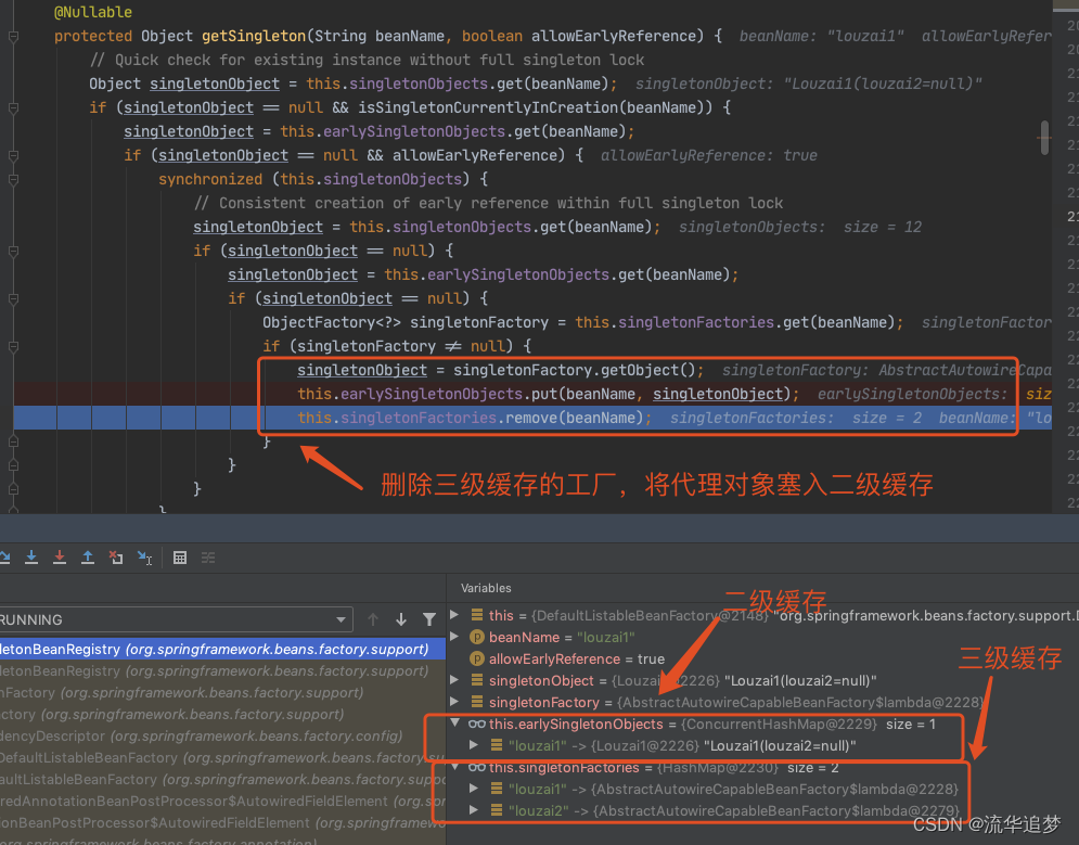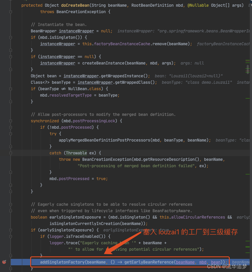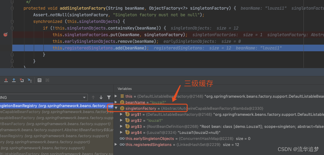 往三级缓存 singletonFactories 塞入 louzai1 的工厂对象。