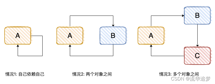 一个或多个对象之间存在直接或间接的依赖关系,这种依赖关系构成一个环形调用,有下面 3 种方式: