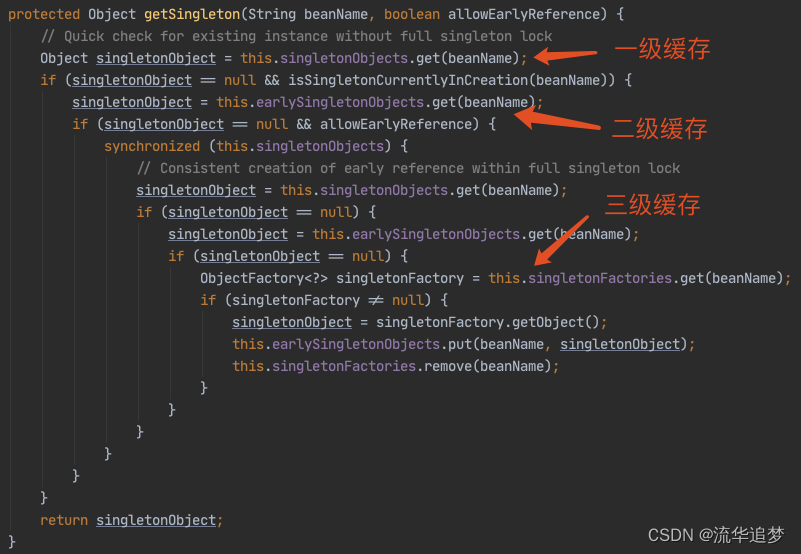- 第一层缓存(singletonObjects):单例对象缓存池,已经实例化并且属性赋值,这里的对象是成熟对象;