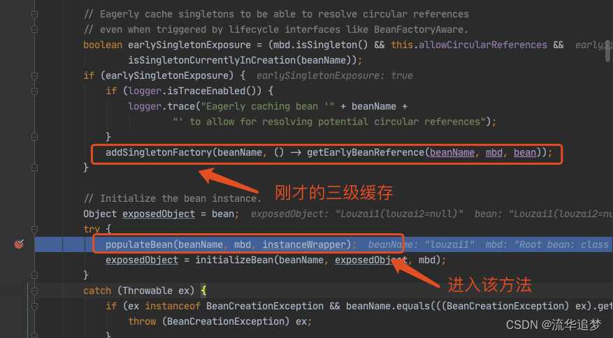 直接找到创建 A 对象时,把实例化的 A 对象存入“三级缓存”的代码,直接用前面的两幅截图: