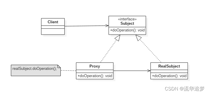 举个简单的例子:我(Client)如果要买(doOperation)房,可以找中介(Proxy)买房,中介直接和卖方(Target)买房。中介和卖方都实现买卖(doOperation)的操作。中介就是代理(Proxy)。