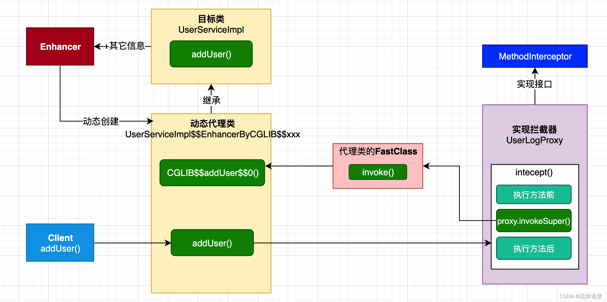 - Spring AOP 基于 CGLIB 进行封装,实现 CGLIB 方式的动态代理 。
