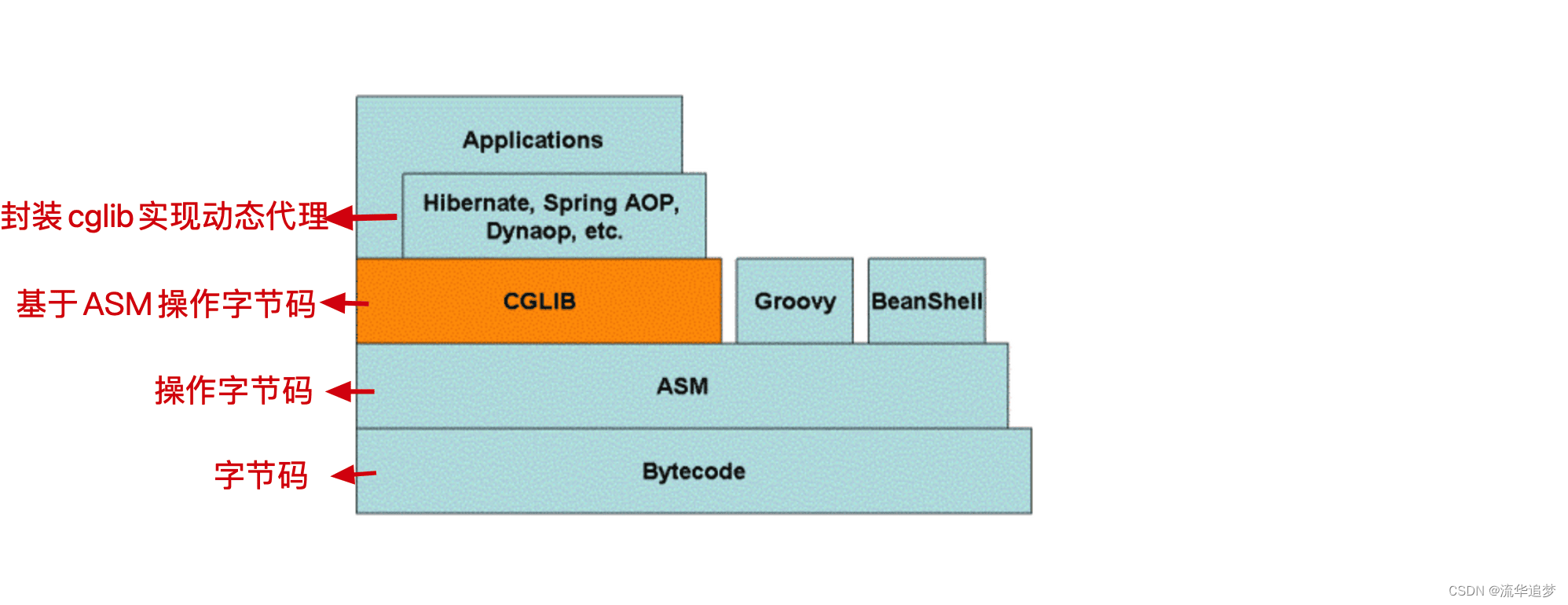 CGLIB 是一个强大的高性能的代码生成包。它广泛的被许多 AOP 的框架使用,例如 Spring AOP 和 dynaop,为他们提供方法的 interception(拦截)。CGLIB 包的底层是通过使用一个小而快的字节码处理框架 ASM,来转换字节码并生成新的类。除了 CGLIB 包,脚本语言例如 Groovy和 BeanShell,也是使用 ASM 来生成 Java 的字节码。当然不鼓励直接使用 ASM,因为它要求你必须对 JVM 内部结构包括 class 文件的格式和指令集都很熟悉。