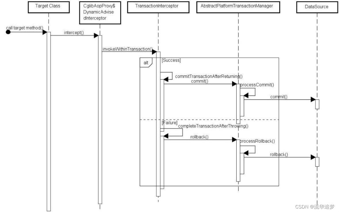 声明式事务其本质是对方法前后进行拦截,然后在目标方法开始之前创建或者加入一个事务,在执行完目标方法之后根据执行情况提交或者回滚事务。