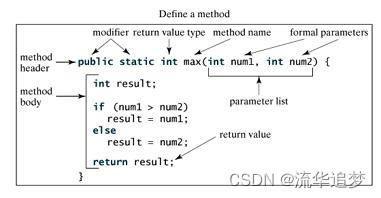 方法包含一个方法头和一个方法体。下面是一个方法的所有部分: