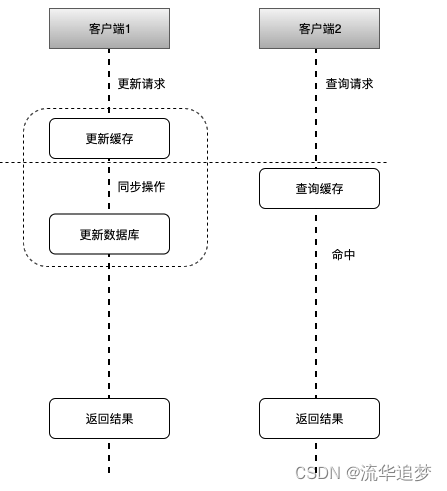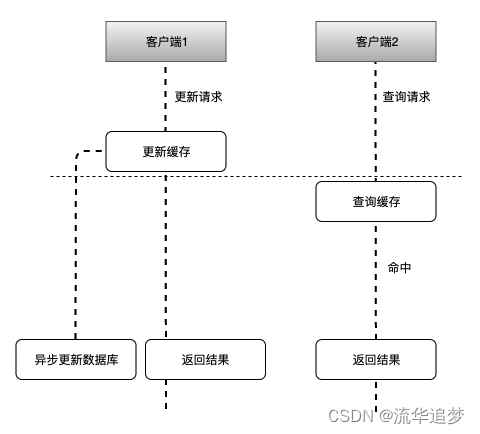 - 客户端1 更新缓存中数据 A,缓存同步更新数据库中数据 A,再返回结果;