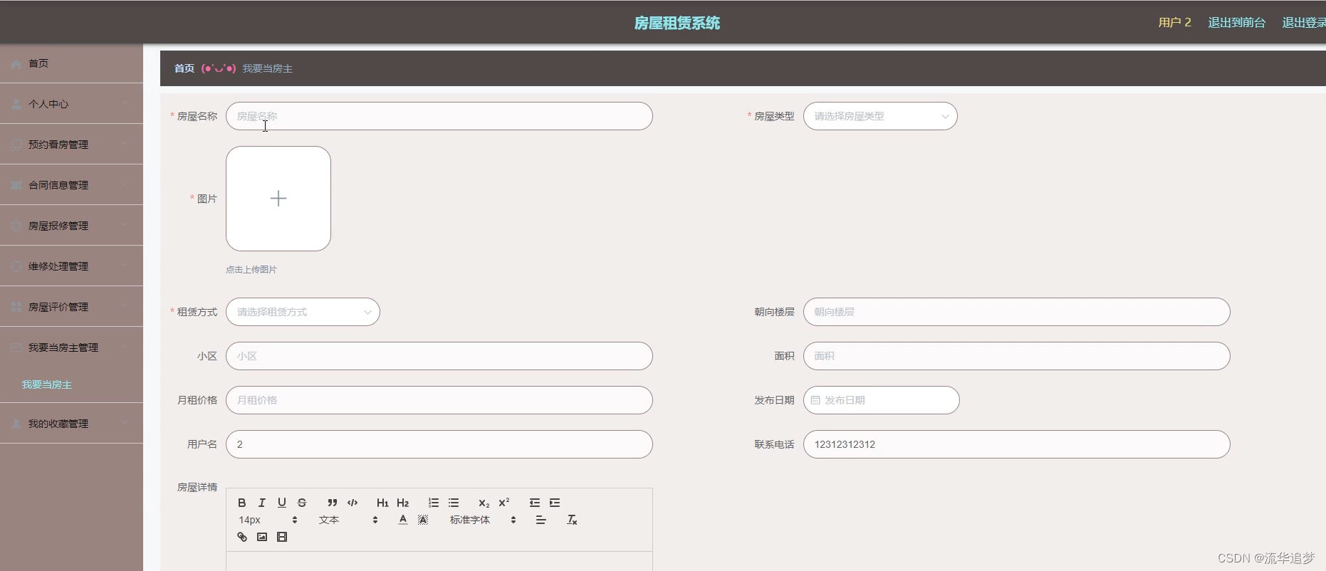 我要当房主管理,我要当房主页面可以进行查看房屋名称、房屋类型、图片、租赁方式、小区、月租价格、用户名、房屋详情、朝向楼层、面积、发布日期、联系电话等信息,进行输入房屋信息、用户信息,进行提交审核操作,如图所示: