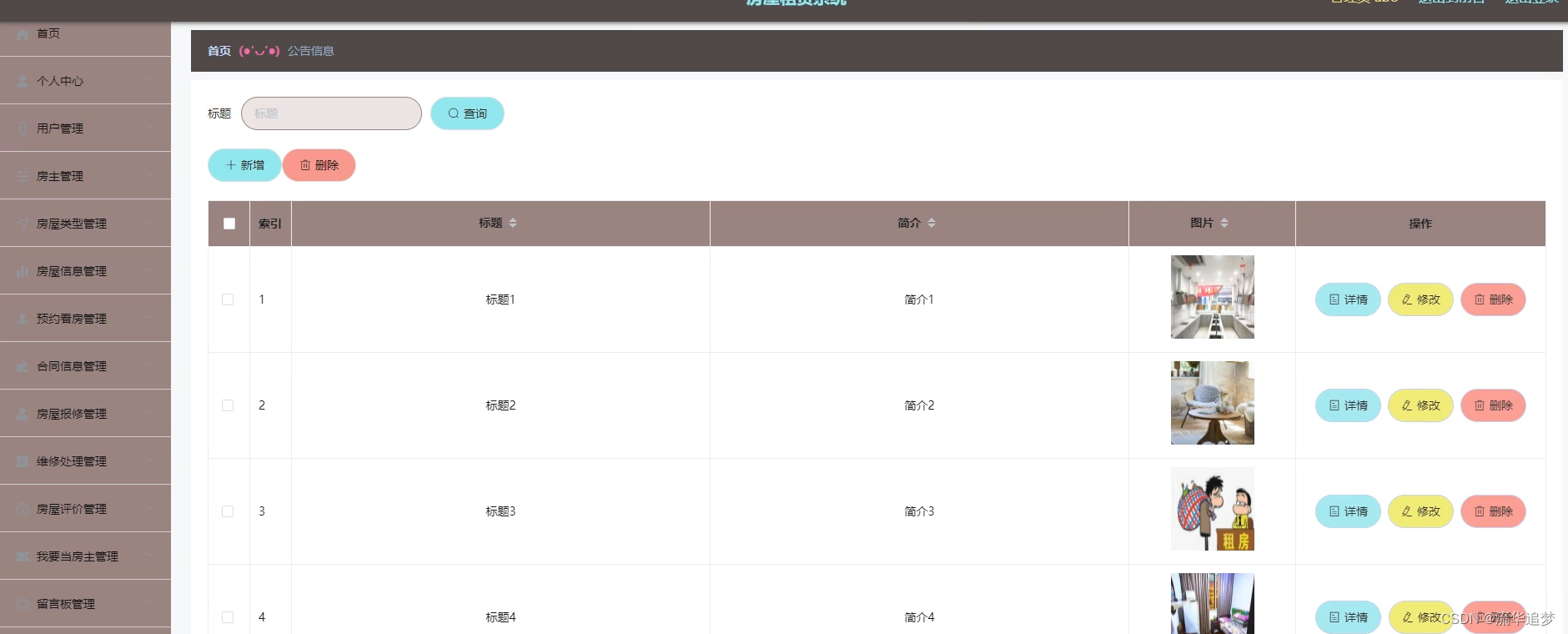 我要当房东信息:通过列表可以查看房屋名称、房屋类型、图片、租赁方式、小区、月租价格、用户名、房屋详情、朝向楼层、面积、发布日期、联系电话等信息等信息,进行查看详情或修改、删除操作,如图所示: