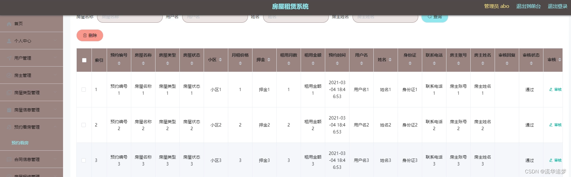 预约看房管理:通过列表可以获取预约编号、房屋名称、房屋类型、房屋状态、小区、月租价格、押金、租用月数、预约时间、用户名、姓名、身份证、联系电话、房主账号、房主姓名、审核回复、审核状态等信息,进行审核或删除操作,如图所示: