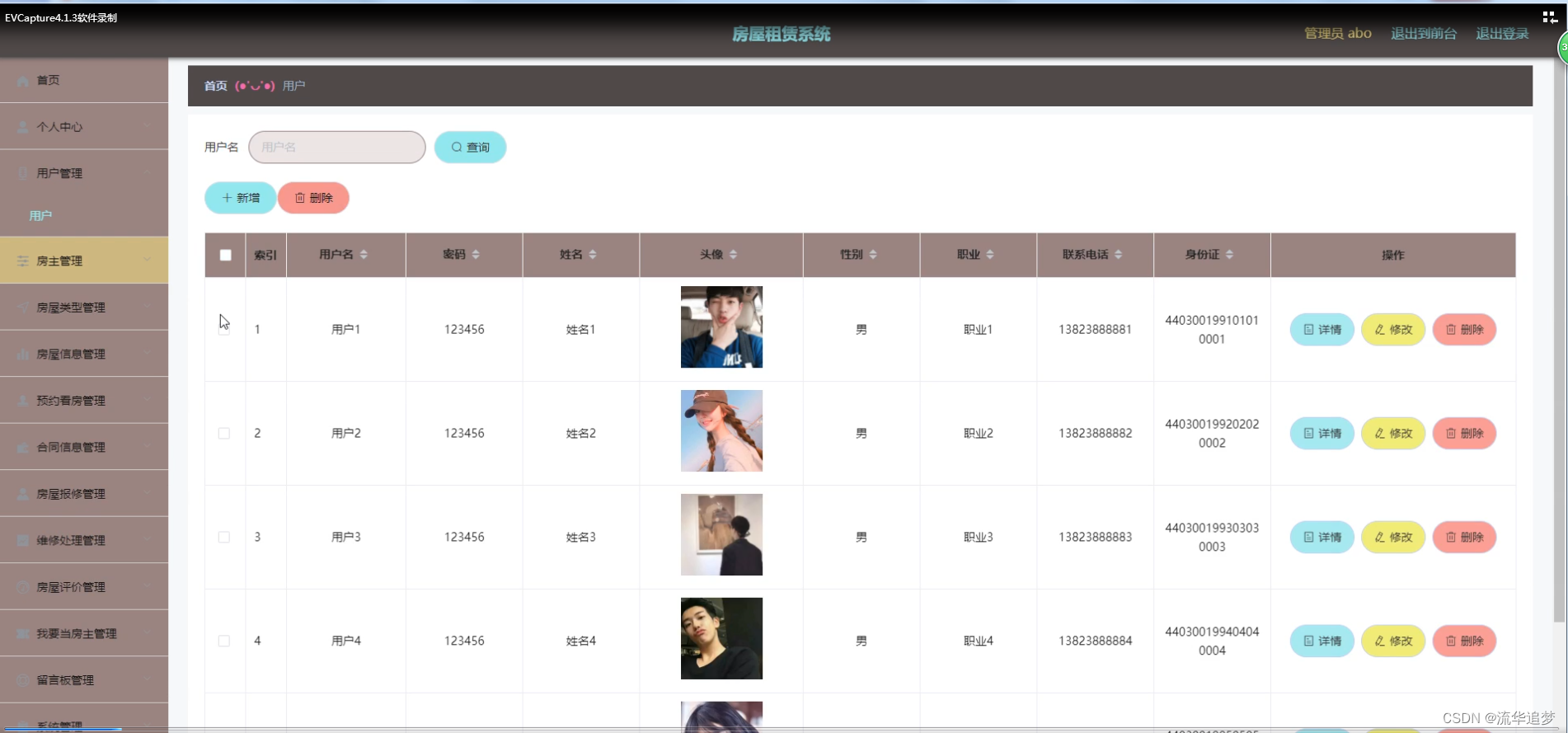 房主管理:通过列表可以获取用户名、密码、姓名、头像、性别、职业、联系方式、身份证号、进行查看用户信息或修改删除操作还可以通过新增进行添加用户信息操作,如图所示: