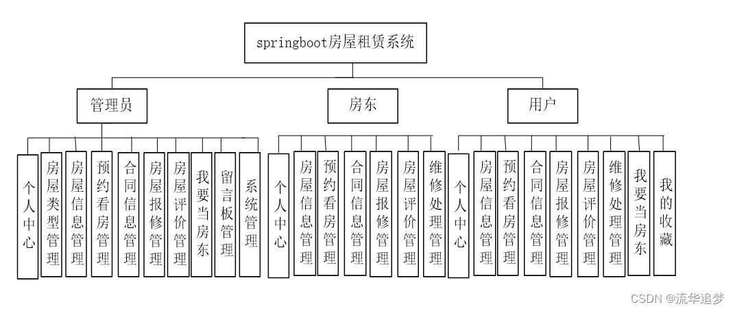 房屋租赁系统的结构,系统实现的功能模块如下图所示: