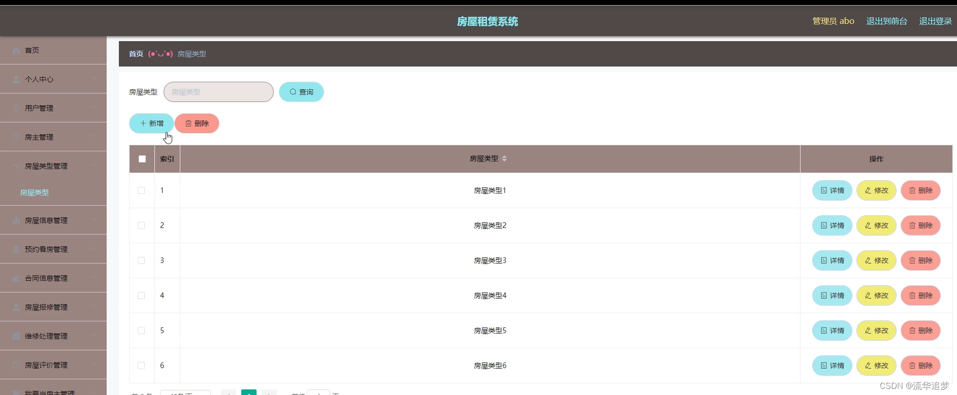 房屋类型管理:通过列表可以进行查看房屋类型,进行查看详情或修改、删除操作,并通过新增进行添加类型信息,如图所示: