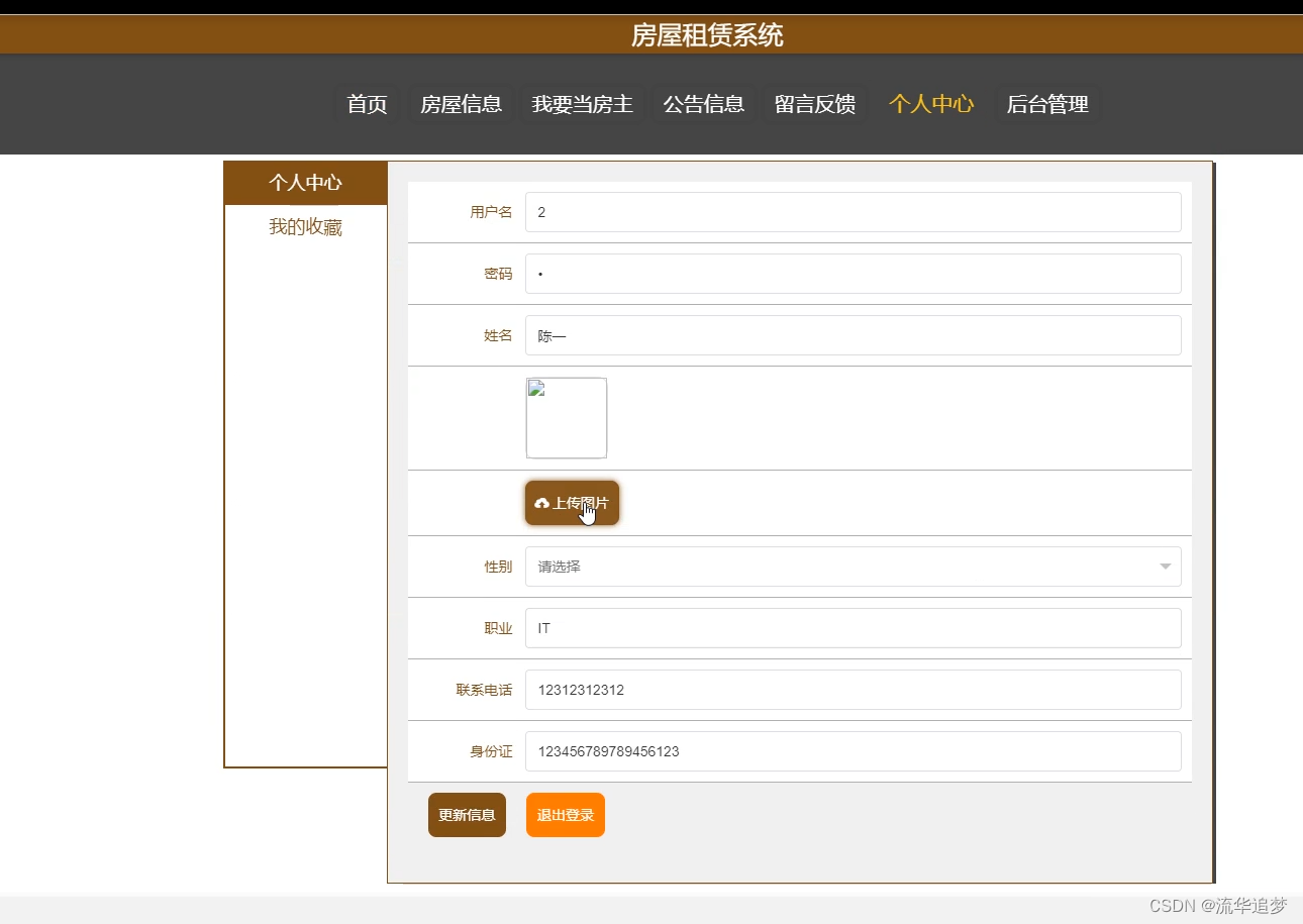 通过个人中心页面可以进行修改或更新个人信息的用户名、密码、性别、职业、联系方式、上传头像身份证号等信息进行更新信息操作。如图所示: