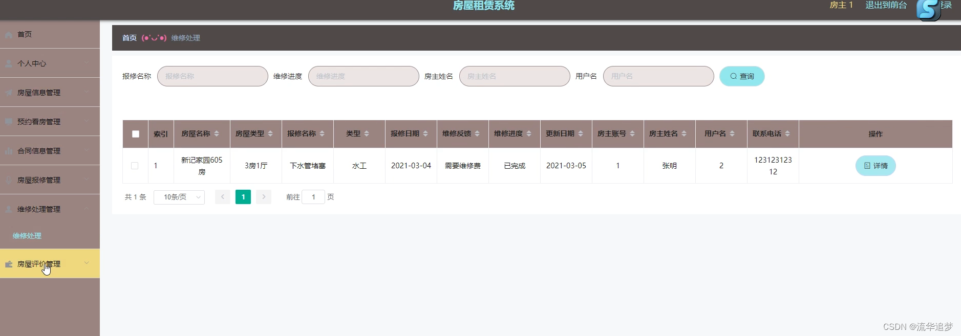 维修处理管理:通过列表可以进行查看房屋名称、房屋类型、报修名称、类型、报修日期、维修日期、维修反馈、维修进度、更新日期、房主账号、房主姓名、用户名、联系电话等信息,进行查看详细信息操作,如图所示:
