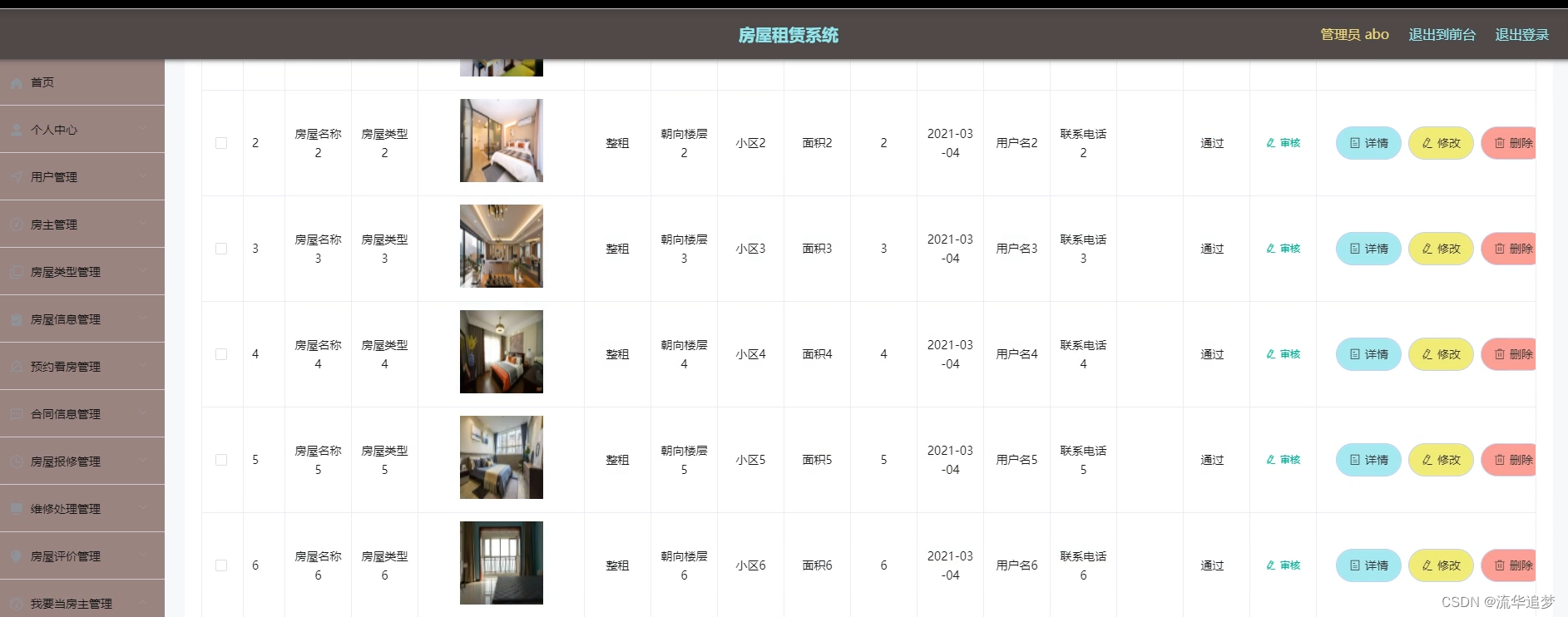 我要当房东信息:通过列表可以查看房屋名称、房屋类型、图片、租赁方式、小区、月租价格、用户名、房屋详情、朝向楼层、面积、发布日期、联系电话等信息,进行查看详情或修改、删除操作或进行审核操作,如图所示: