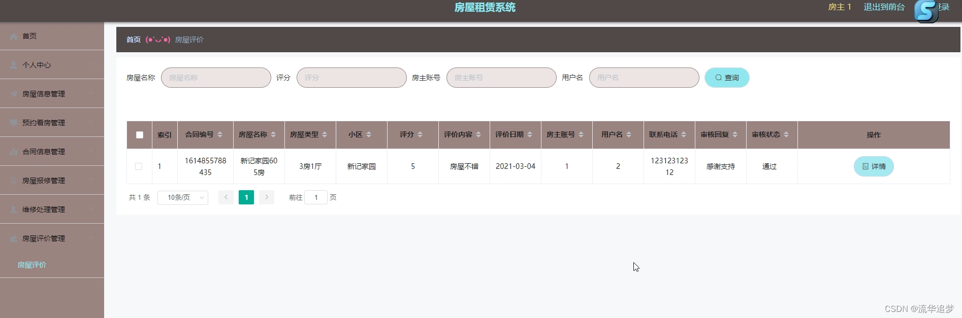 房屋评价管理:通过列表可以获取合同编号、房屋名称、房屋类型、小区、评分、评价内容、评价日期、房主账号、用户名、联系电话、审核回复、审核状态等信息,进行查看详情操作,如图所示: