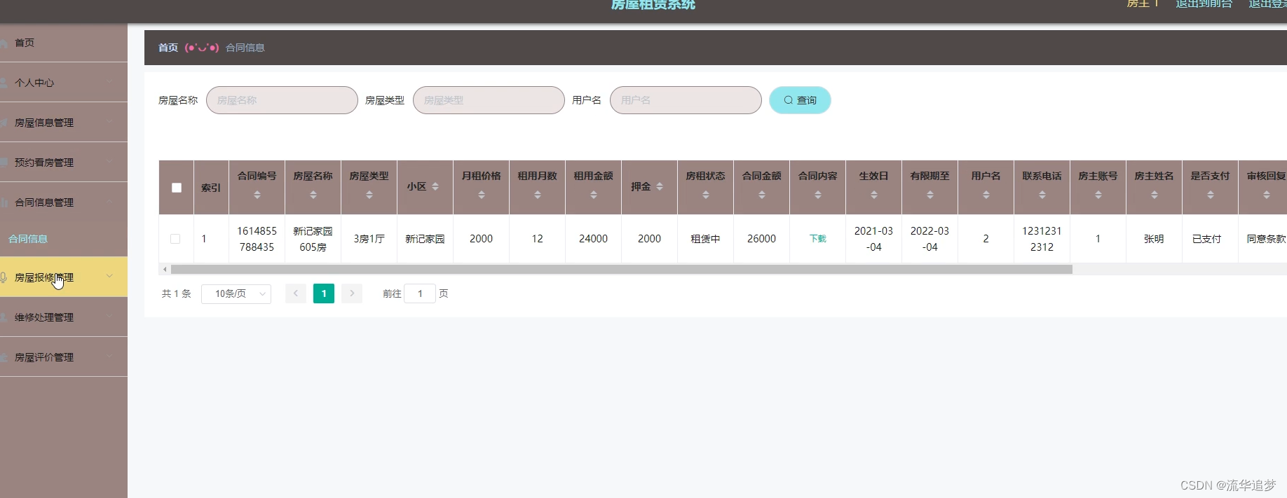 房主登录成功后,进入后台页面,可以进行查看个人中心、房屋信息管理、预约看房管理、合同信息管理、房屋报修管理、维修处理管理、房屋评价管理等功能模块,进行相对应操作。如图所示: