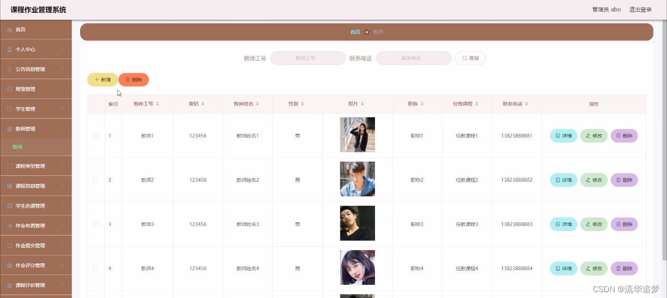 学生管理,在学生管理页面中可以通过填写学号、密码、学生姓名、性别、头像、手机、邮箱、班级等信息进行详情、修改,如图所示。还可以根据需要对教师管理进行详情,修改或删除等详细操作,如图所示: