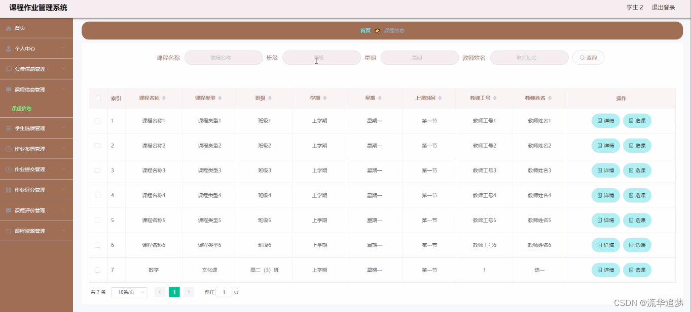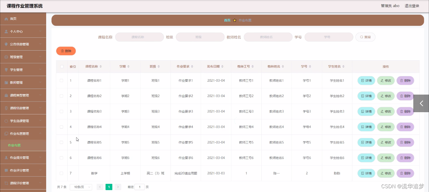 作业布置管理,在作业布置管理页面中可以查看课程名称、学期、班级、作业要求、发布日期、教师工号、教师姓名、学号、学生姓名等信息,并可根据需要对作业布置管理进行详情、修改或删除等详细操作,如图所示: