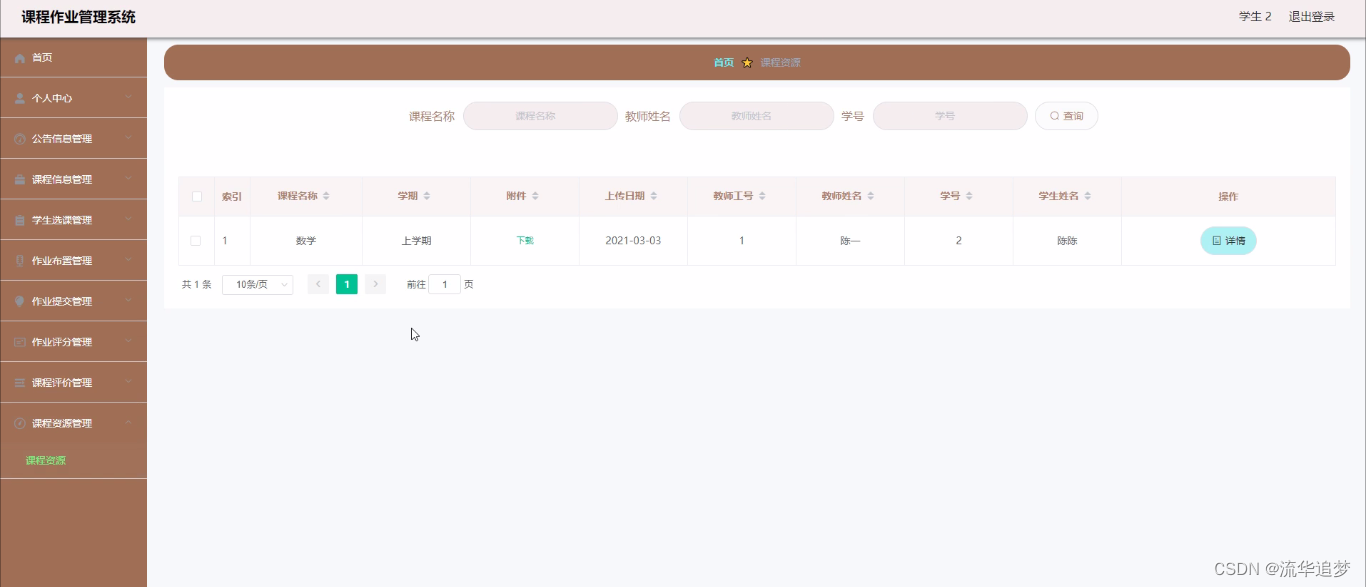 课程资源管理,在课程资源管理页面中通过填写课程名称、学期、附件、上传日期、教师工号、教师姓名、学号、学生姓名等内容进行详情、删除,如图所示: