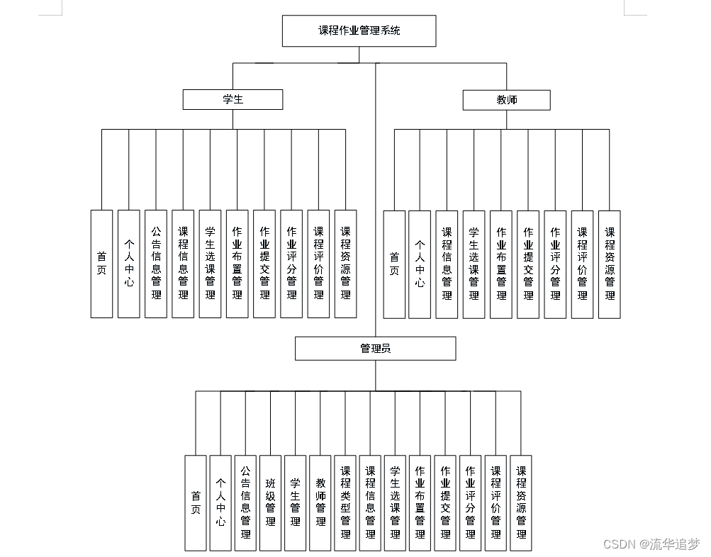 管理员登录进入课程作业管理系统可以查看首页、个人中心、公告信息管理、班级管理、学生管理、教师管理、课程类型管理、课程信息管理、学生选课管理、作业布置管理、作业提交管理、作业评分管理、课程评价管理、课程资源管理等信息。