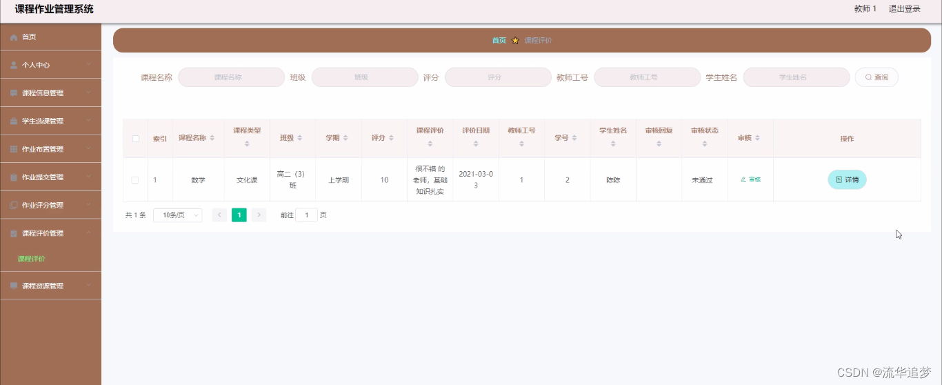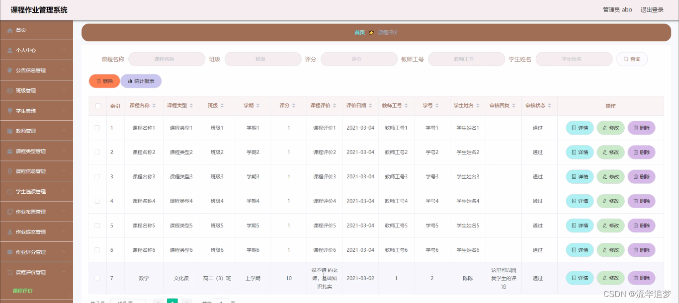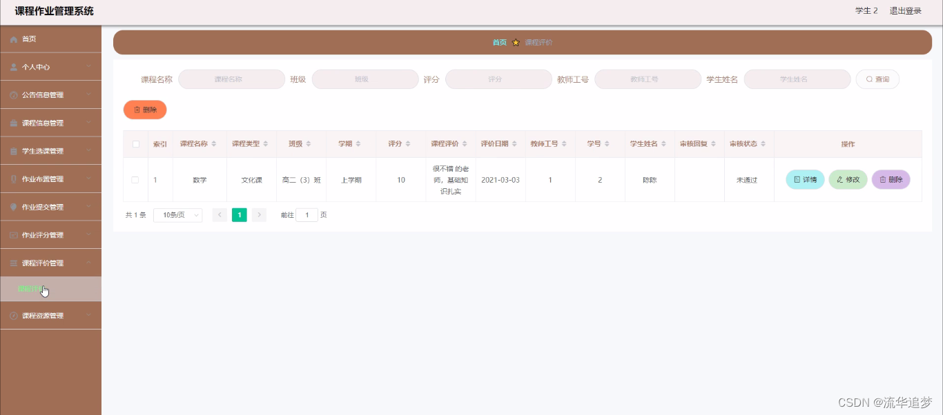 课程评价管理,在课程评价管理页面中通过填写课程名称、课程类型、班级、学期、评分、课程评价、评价日期、教师工号、学号、学生姓名、审核回复、审核状态等内容进行详情、删除,如图所示: