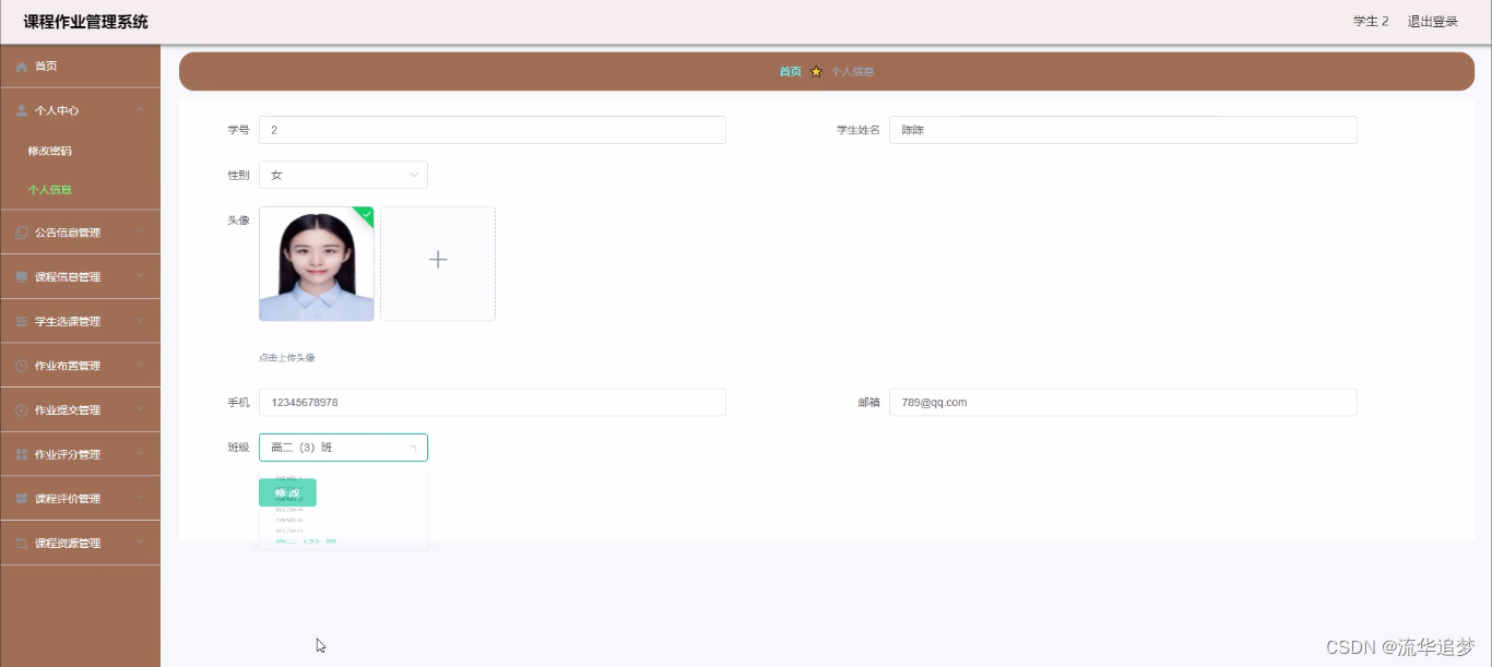 个人信息,在个人信息页面中通过填写学号、密码、学生姓名、性别、头像、手机、邮箱、班级等信息还可以根据需要对个人信息进行修改,如图所示: