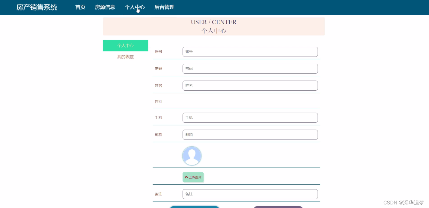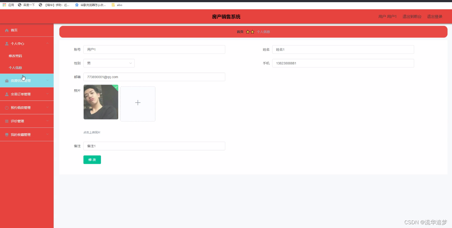 用户点击进入到系统操作界面,可以对首页、个人中心、房源信息管理、交易订单管理、预约看房管理、评价管理、我的收藏管理等功能模块,个人信息:通过列表可以获取账号、姓名、性别、手机、邮箱、照片、备注并进行修改操作,如图所示: