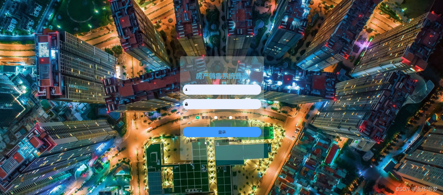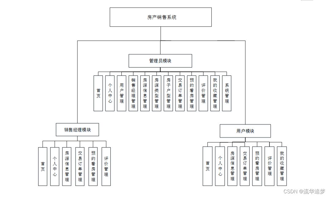 管理员通过用户名和密码、角色填写完成后进行登录,如图所示。管理员登录成功后进入到系统操作界面,可以对首页、个人中心、用户管理、销售经理管理、房源信息管理、房源类型管理、房子户型管理、交易订单管理、预约看房管理、评价管理、我的收藏管理、系统管理等功能模块进行相对应操作。